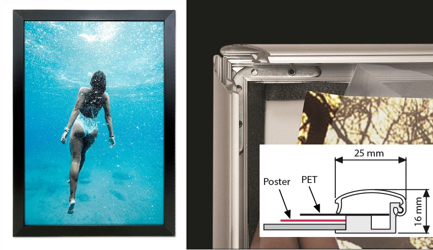 Waterproof zwarte wissellijst die daardoor zeer geschikt is voor buitengebruik. De wissellijst is verder uitgevoerd met een 25 mm aluminium klemprofiel met daarin de afdichting en waterafvoergaten. Wordt geleverd met een ontspiegelend PET folie en voor de bevestiging op de wand schroeven en pluggen. Ook leverbaar in afwijkende maten en in RAL kleuren.