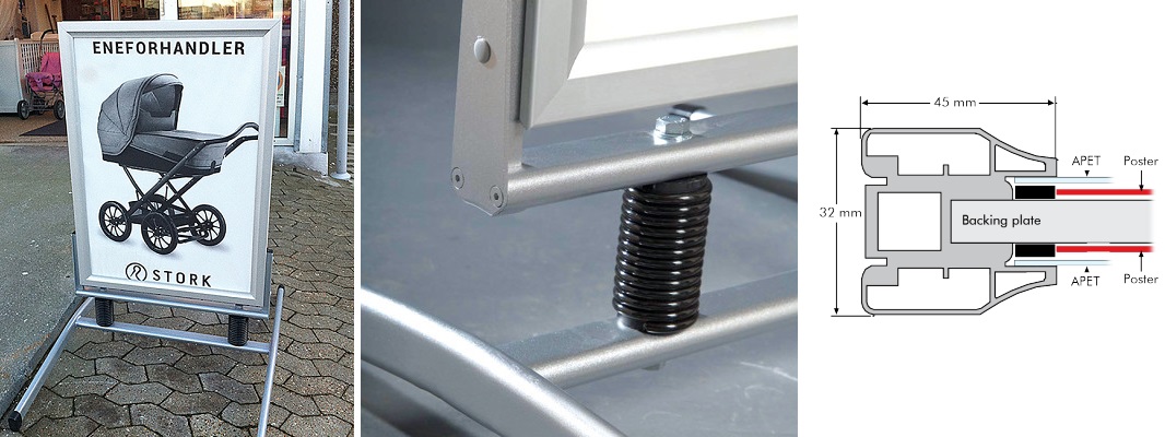 Kwaliteits waterproof stoepbord met grijs gegalvaniseerd onderstel en met stalen veren. Dubbelzijdig wissellijstprofiel met verstekhoeken, lijst aluminium in zilverkleur 45 mm. Levering met poster(s) op aanvraag. Zie voor meer informatie bijgevoegde afbeeldingen en PDF.
